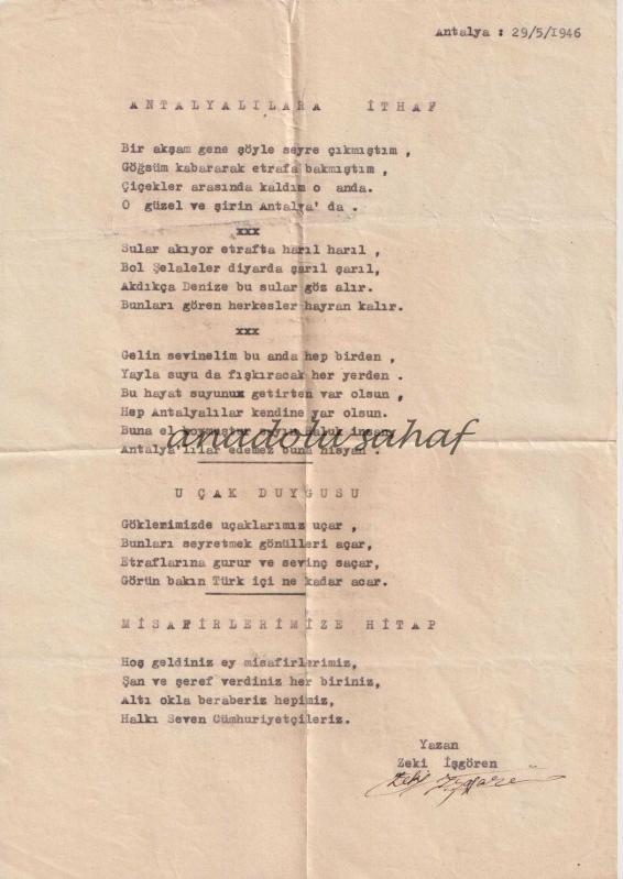Zeki İşgören İmzalı Antalyalılara İthaf, Uçak Duygusu, Misafirlerimize Hitap Başlıklı Şiirler, 29 Mayıs 1946, en son 1 yıl önce güncellenmiştir.