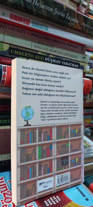 ZEKİ OLDUĞUNU DÜŞÜNÜYOR MUSUN? Sence de Hamlet biraz uzun değil mi? Peki bir bilgisayarın vicdanı olabilir mi? İnsan ne zaman ölmüş sayılır? Ya da dünyada kaç kum tanesi vardır? Doğanın doğal olduğunu da kim söyledi? Eğer Kaliforniya'da değilsen, öyle bir yerin var olduğunu nereden biliyorsun? Yoksa sen zeki olduğunu mu düşünüyorsun? Oxford ve Cambridge üniversitelerindeki hocalar, en keskin zekalı öğrencileri bulmak için her yıl birbirinden şaşırtıcı sorular soruyor. Yazar John Farndon da bu sorular arasından ilginç olanları cevaplıyor, bizleri felsefeden fiziğe, edebiyattan logaritmaya kadar uzanan ilginç "akıl" oyunlarına davet ediyor.