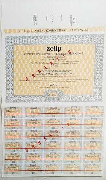 Zetip Zeytinburnu Kombine TekstiL Fabrikası Hisse Senedi - TAHVİL - SPECIMEN - TURUNCU RENK, 10 ay önce satışa sunulmuştur.