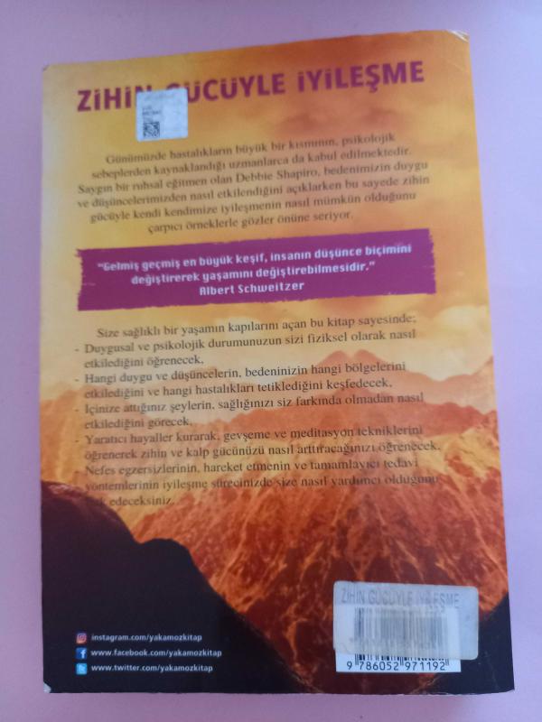 Zihin Gücüyle İyileşme duygu ve düşünceler bedeni ve hastalıkları nasıl etkiler kitap,sağlık,insan hiç kullanılmamistir., Debbıe Shapıro tarafından kaleme alınmıştır. Kitap Yakamoz tarafından yayınlanmıştır. Bu baskının çevirisi Taner Gezer tarafından yapılmıştır. 325 sayfadır. Zihin Gücüyle İyileşme duygu ve düşünceler bedeni ve hastalıkları nasıl etkiler kitap,sağlık,insan hiç kullanılmamistir. adlı eser Türkçe dilindedir.