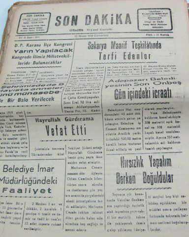 adapazarı son dakika gazetesi sayı 1421 1959, 7 yıl önce satışa sunulmuştur.