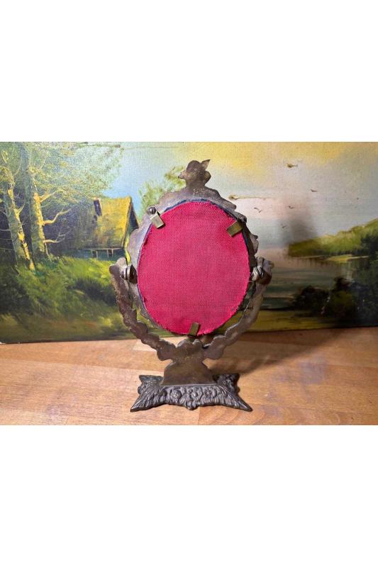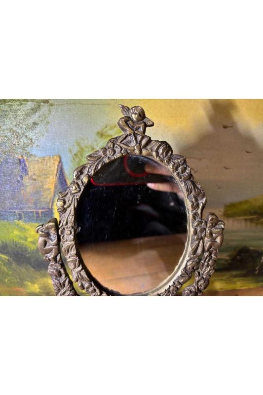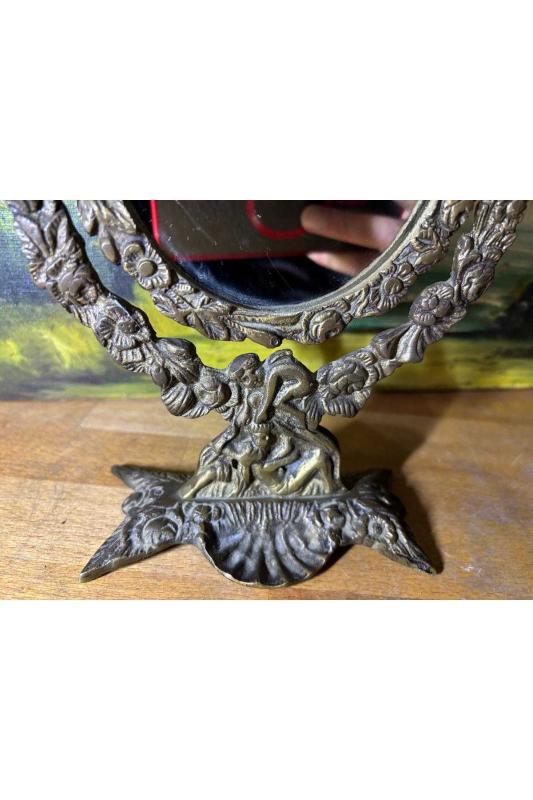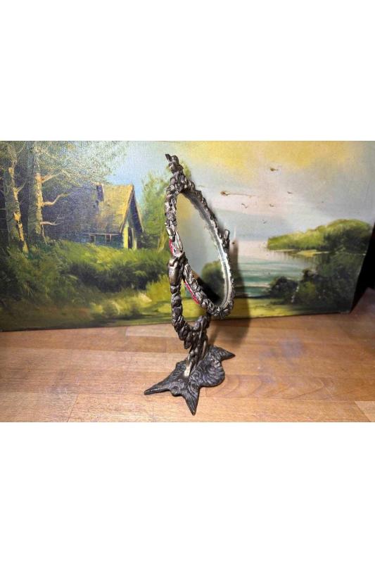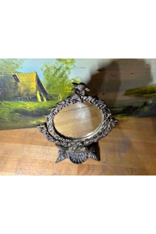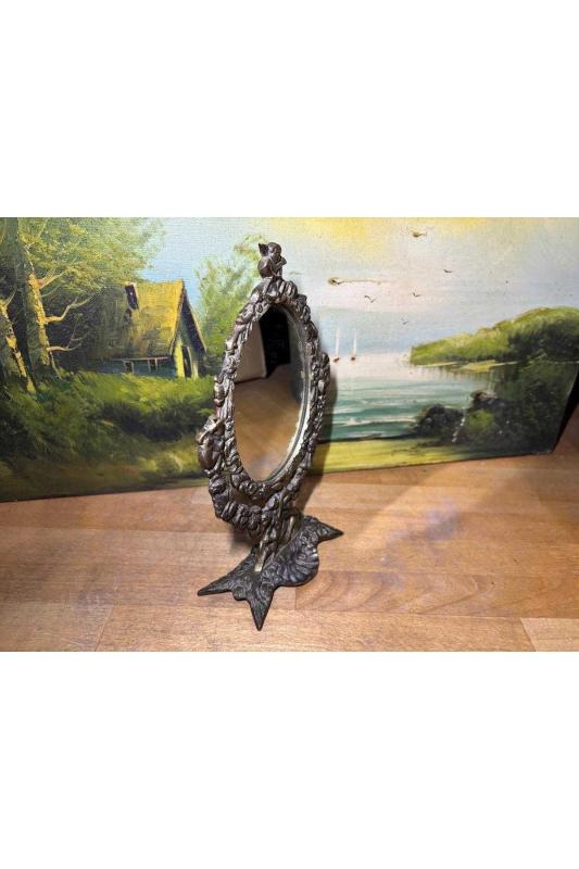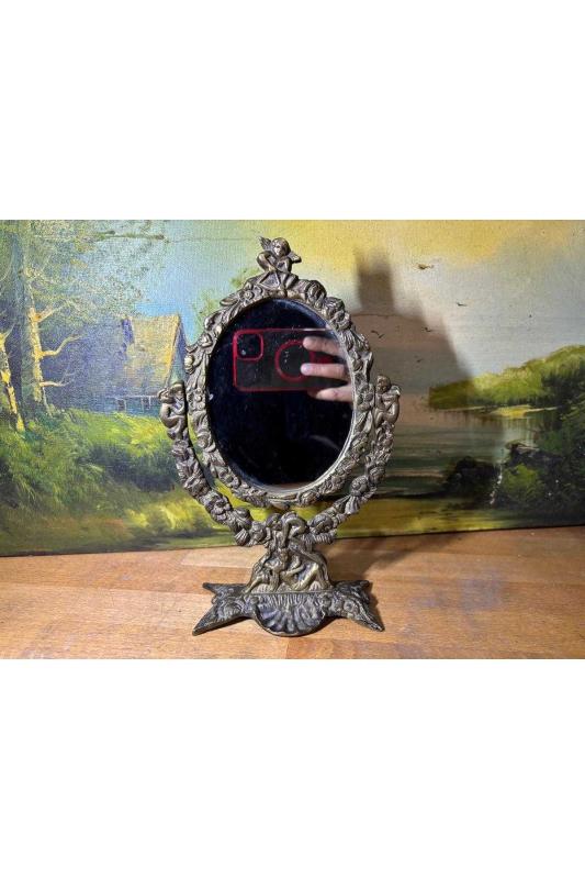 antika Pirinç makyaj aynası 26 cm 16 cm ölçülerinde başlıklı antika/koleksiyon objesinin menşei belirtilmemiştir. Objenin ait olduğu dönem bilinmeketedir.