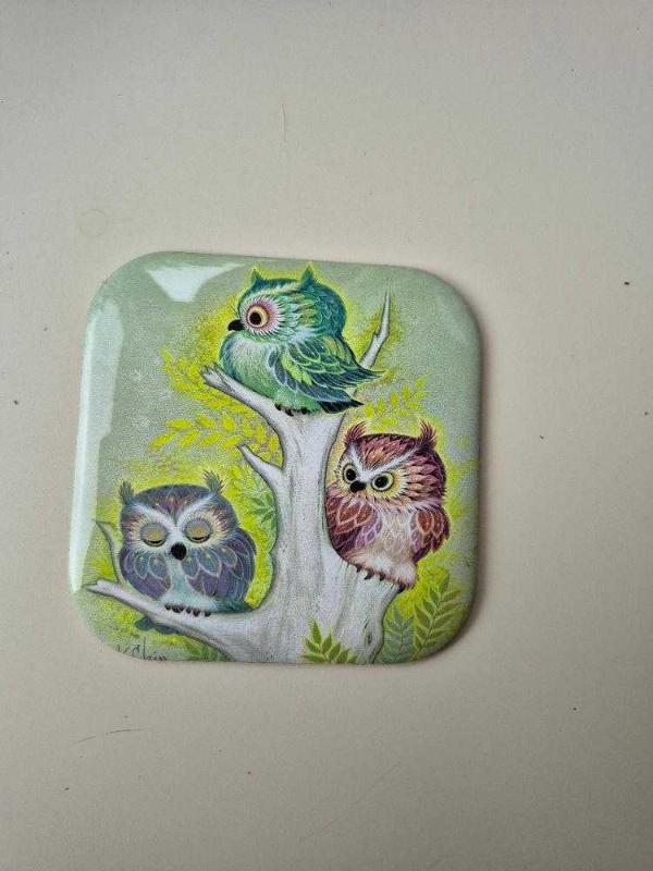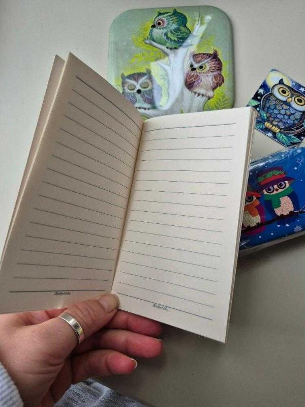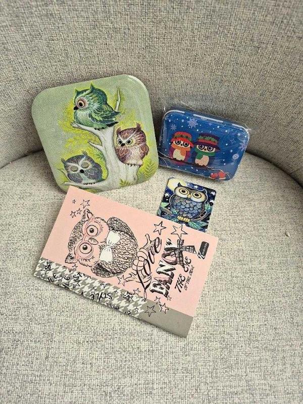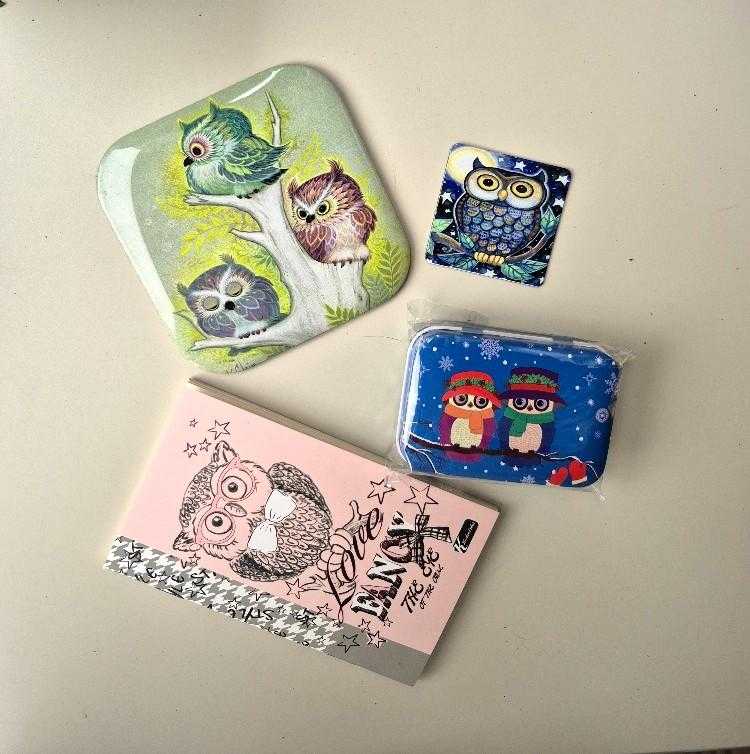 hepsi baykuş temalı,bir adet içi çizgili not defteri (13*8.5cm) , bir adet magnet (5*5cm), bir adet metal kutu (8*5cm) ve bir adet metal (alt kısmı mantar) bardak altlığından (10*10cm)oluşan, toplan 4 parçalık set.