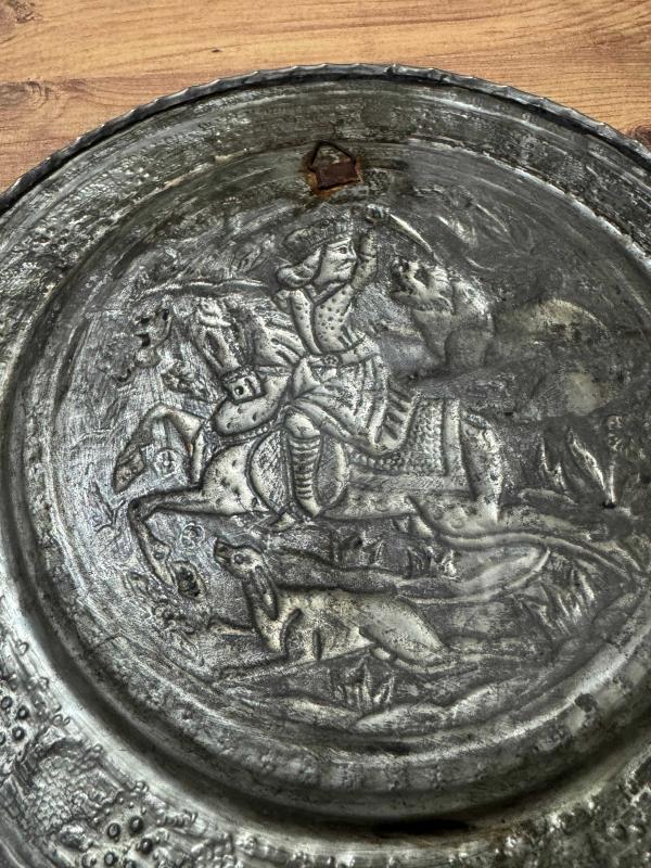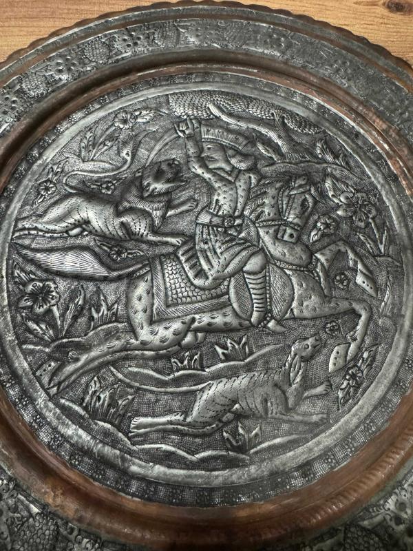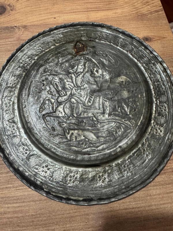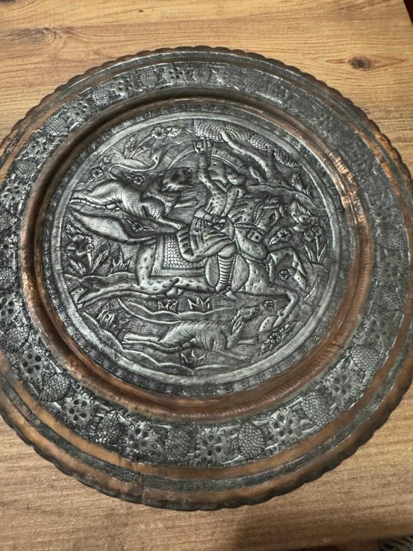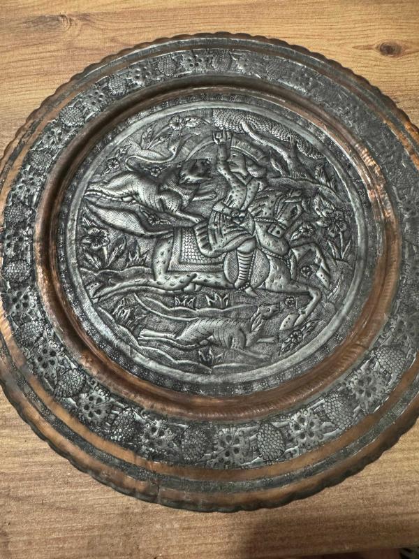 bu tabak, üzerindeki detaylı figürlerle yüksek dekoratif değere sahiptir. Hem koleksiyonluk hem de şık bir duvar aksesuarı arayanlar için kaçırılmayacak bir parçadır. Orta bölümde at üzerinde kılıçlı süvari ve av sahnesi detaylı kabartma (repousse) tekniğiyle işlenmiştir. Tabağın bordür kısmı stilize çiçek ve bitki motifleriyle bezelidir. Bakır üzerine kalay kaplama olup, zamanla oluşan doğal patini sayesinde otantik bir görünüm kazanmıştır. Arkasındaki askı halkası sayesinde duvar dekoru olarak kullanılabilir; şark köşeleri, ofisler veya salonlar için uygundur, 25 gün önce kitantik’te satışa sunulmuştur.