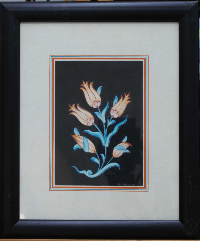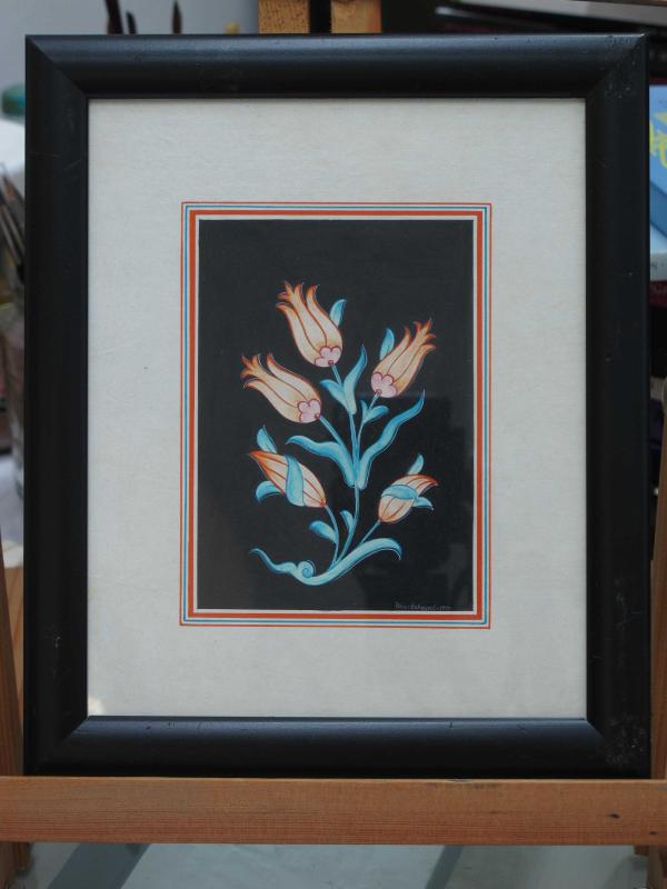 Çerçeveli 20x24 cm boyutlarında, guaj boya ile yapılmış lale kompozisyonu tablosu. Orijinal, imzalı, tek nüshadır. Sanatçı: İlhan Özkeçeci
