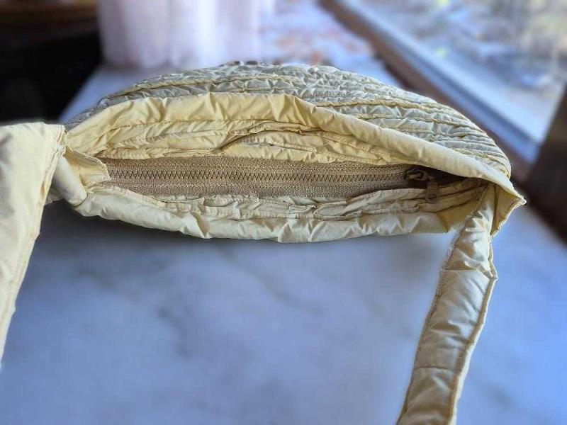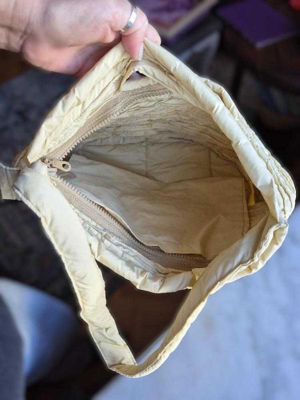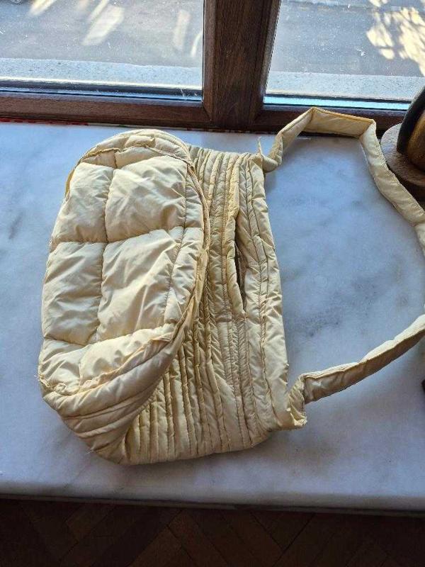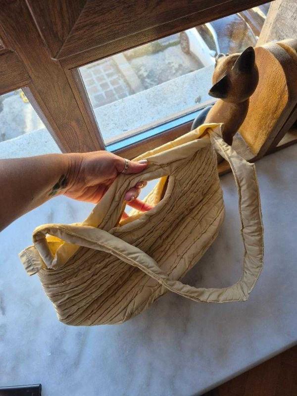 hediye geldi, hiç kullanılmadı. içi elyaf dolgulu.sıvı itici özellikte kumaştan.içinde bir cebi var. fermuarla kapanıyor. hem el, hem kol çantası olarak kullanılabiliyor. ölçüler: sap 30 cm, boy 25cm, en 28 cm.