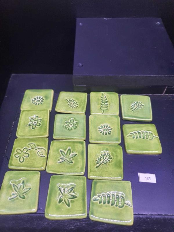 El yapımı seramik Bitki /floral kabartma motifli yeşil sırlı karolar (glaze) 14 adet Türk yapımı 4x4 cm