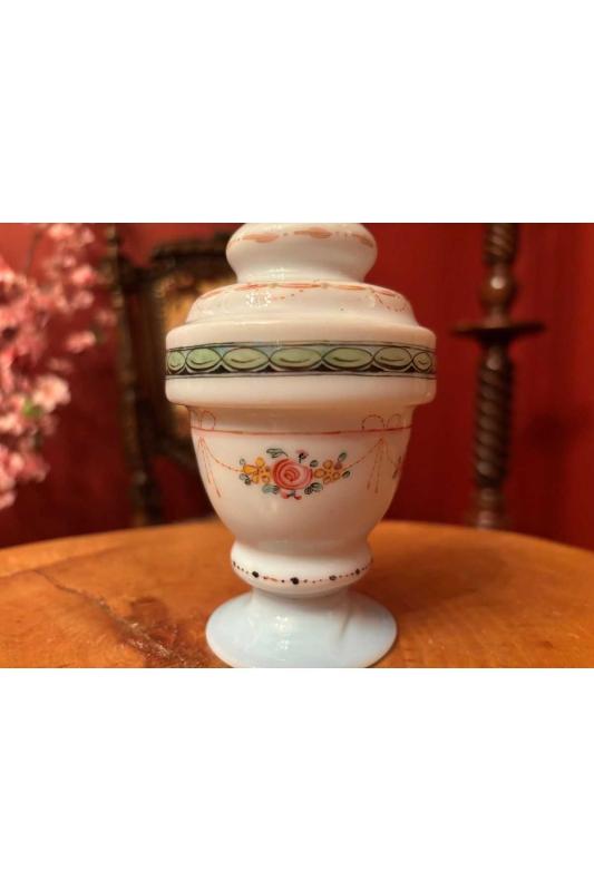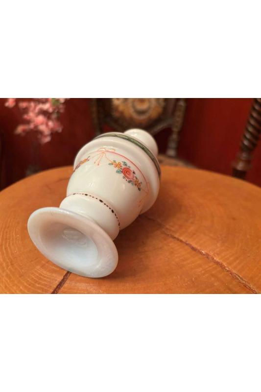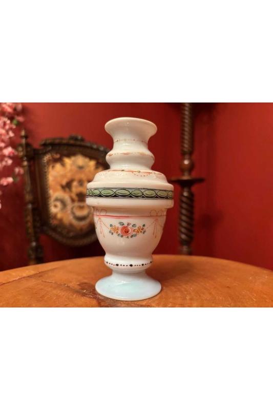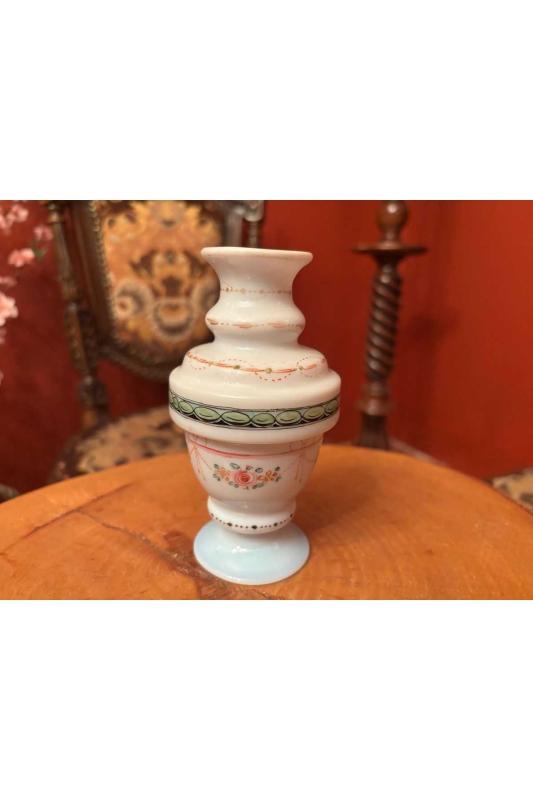 italyan El boyama Opalin vazo 13,5 cm boyunda başlıklı antika/koleksiyon objesinin menşei belirtilmemiştir. Objenin ait olduğu dönem bilinmeketedir.