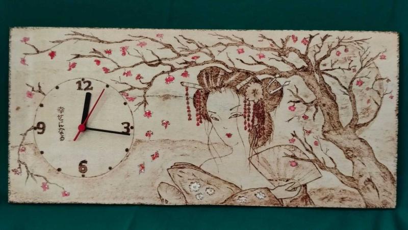 ahşap yakma japon kadın temalı el işi duvar saati