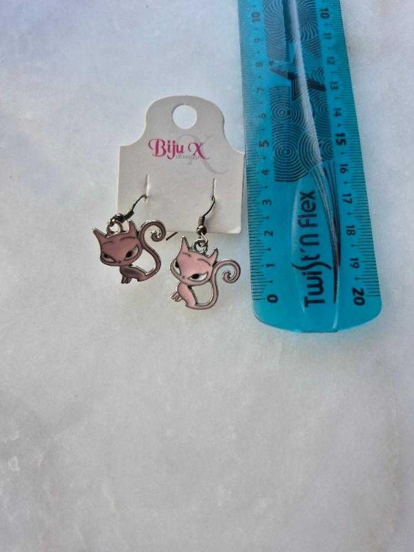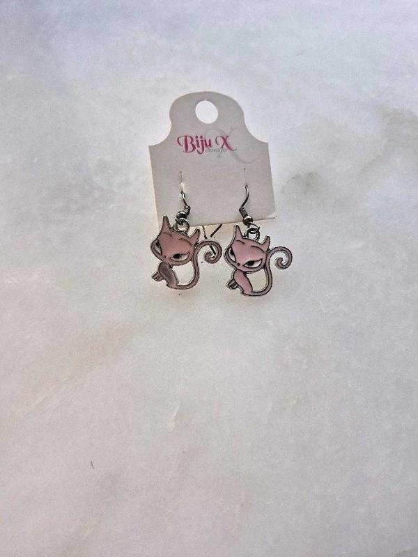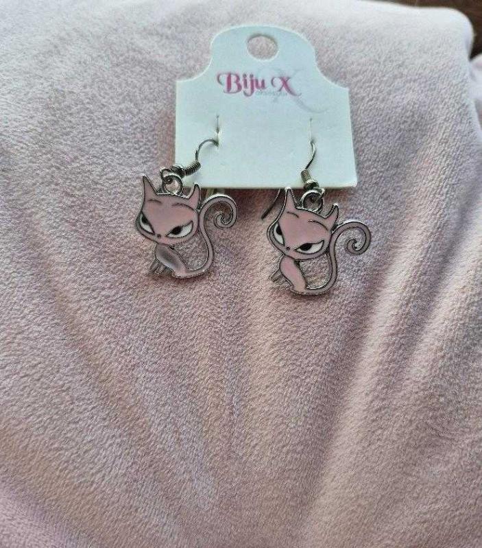 toz pembe mine kedili bijoteri küpe. silikon kapatıcılı, sallantılı. 3cm.sıfır