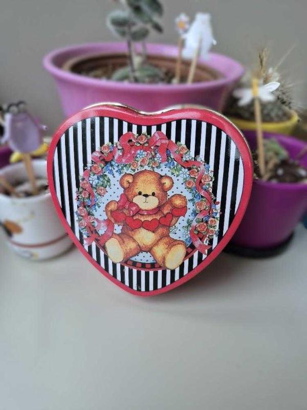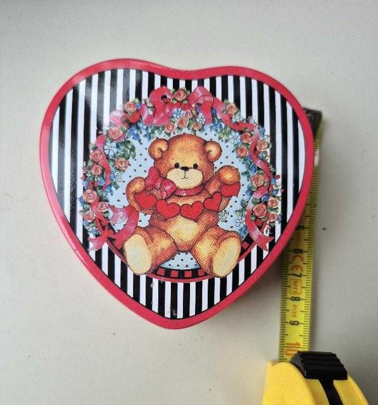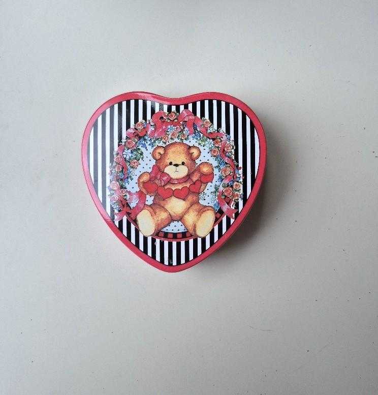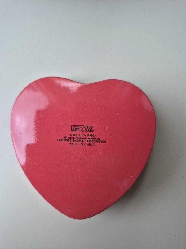 vintage ayıcıklı metal kutu kalp şeklinde, 1991 enesco üretimi. lucy and me ayısı. kırmızı değil-fuşya kenar ve arka renk. pas, çzilme, ezilme YOK. koleksiyon parçası olduğundan kusursuz durumda. 10*10*3 cm.
