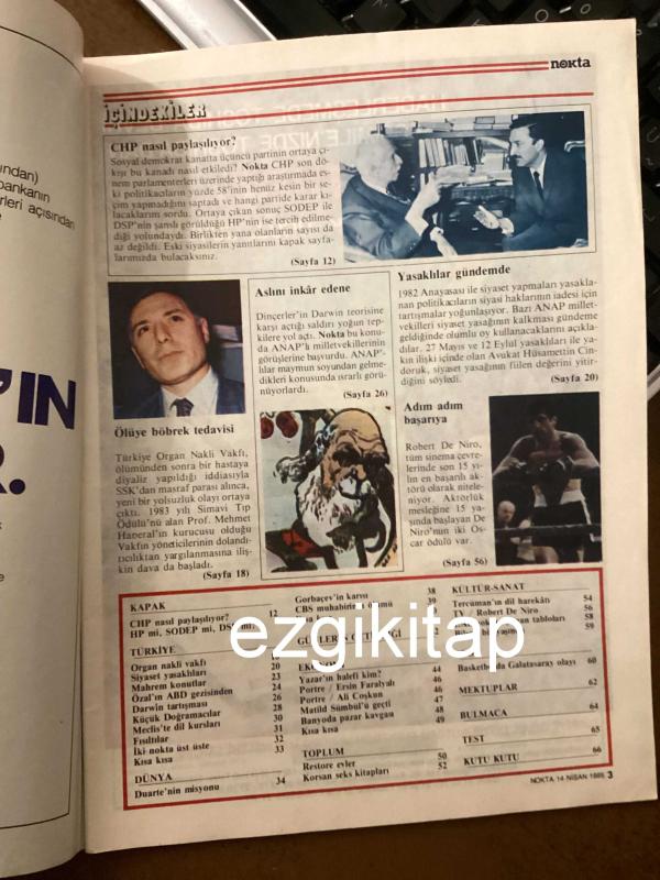 nokta dergisi 14 nisan 1985 sayı 14 yıl 3 (sinema kitap müzik inönü ecevit shp chp sodep siyaset yasaklıları mahrem konutlar turgut özal abd el salvador duarte gerilla lübnan sscb matild manukan korsan pornografi robert de niro ismail altınok) adlı eser, Kitap > Süreli Yayınlar > Dergiler > Siyaset kategorisinde İkinci El olarak satıştadır.