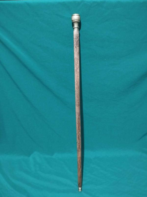pirinç topuz başlı, ayak ve üst boğumları pirinç, ahşap yakma desenli baston, 20 gün önce kitantik’te satışa sunulmuştur.
