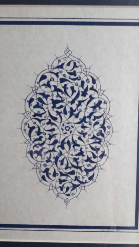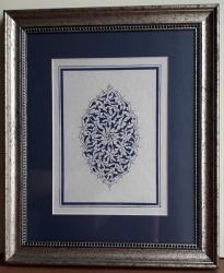 29x35 cm boyutlarında lacivert renkli rumi kompozisyonlu çerçeveli tablo.