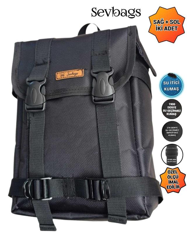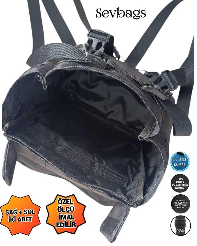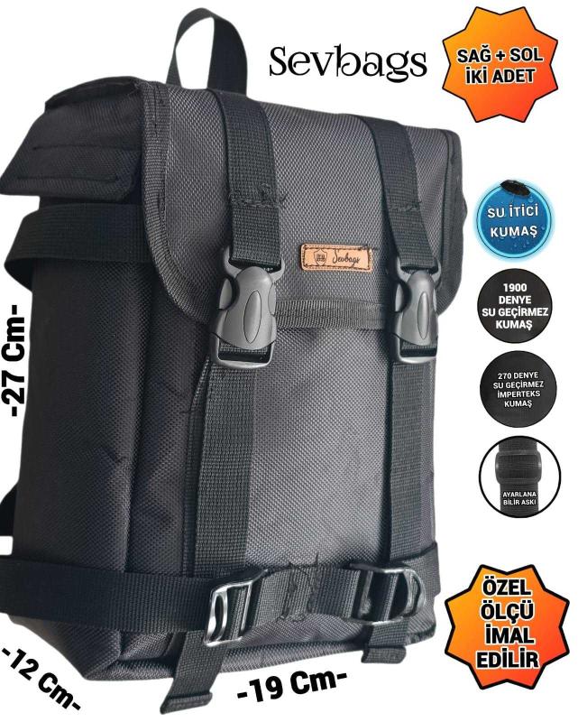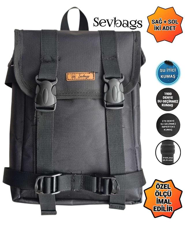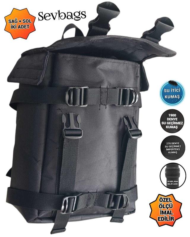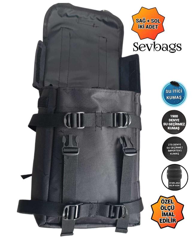 .Sevbags motosiklet koruma demiri avadanlık çantaları .ithal su geçirmez kumaştan imal edildiği için su itici özeliğe sahiptir .İç kısım su geçirmez kumaş ile astarlanmıştır .Elde taşıma kulpu .3 adet yapıştırmalı çırt bağlantı 4 adet kolonlu kambur toka bağlantısı .cırt yapışkanlı ve 2 adet klipsli kapak ön ve yanlar yapışmalı cırt, su almaması için koruyucu kapak . yükseklik 27cm, genişlik 19cm, yan körük 12cm ölçülerine imal edilmiştir .yerli üretim özel ölçü imalat yapılmaktadır