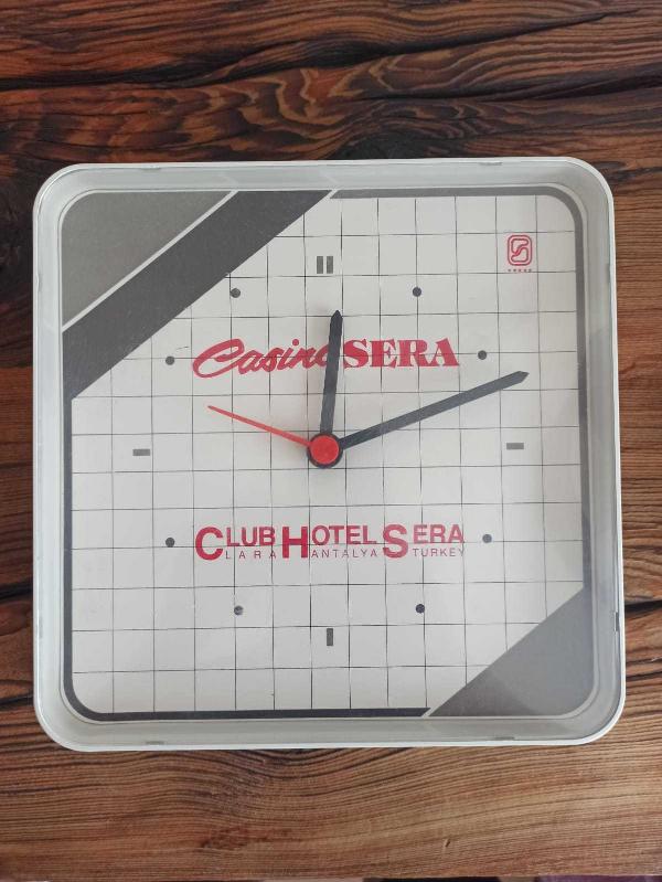 vintage ''Clup Hotel Casino Sera''duvar saati & 20x20 cm başlıklı antika/koleksiyon objesinin menşei belirtilmemiştir. Objenin ait olduğu dönem bilinmeketedir.