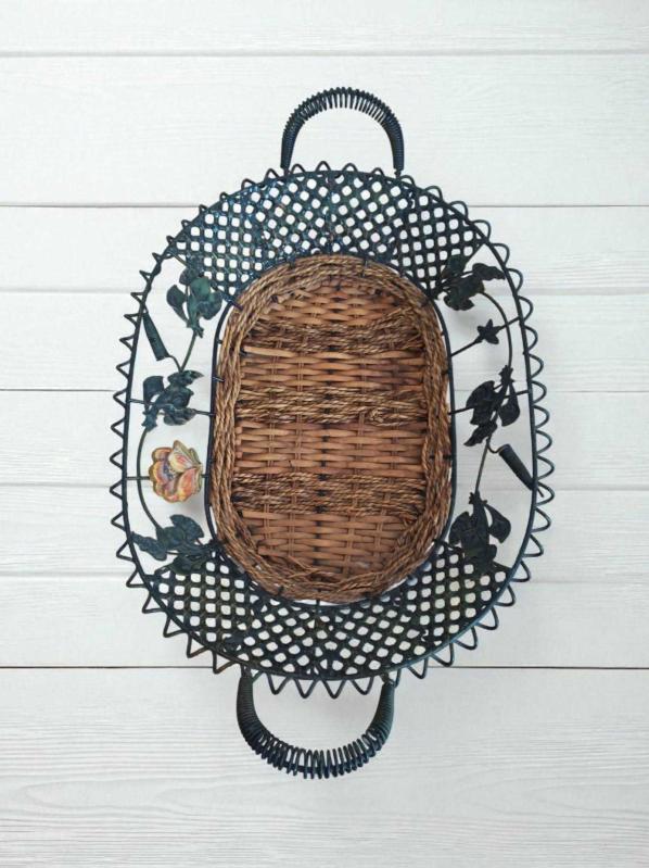 vintage metal ferforje hasırlı kulplu sepet & 47 x 30 cm başlıklı antika/koleksiyon objesinin menşei belirtilmemiştir. Objenin ait olduğu dönem bilinmeketedir.