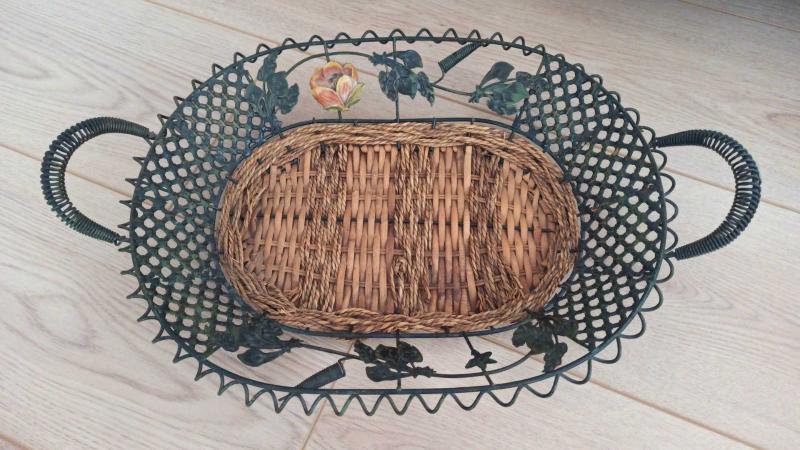 vintage metal ferforje hasırlı kulplu sepet & 47 x 30 cm 47 cm uzunluk 30 cm genişlik metal ve hasır iyi durumda