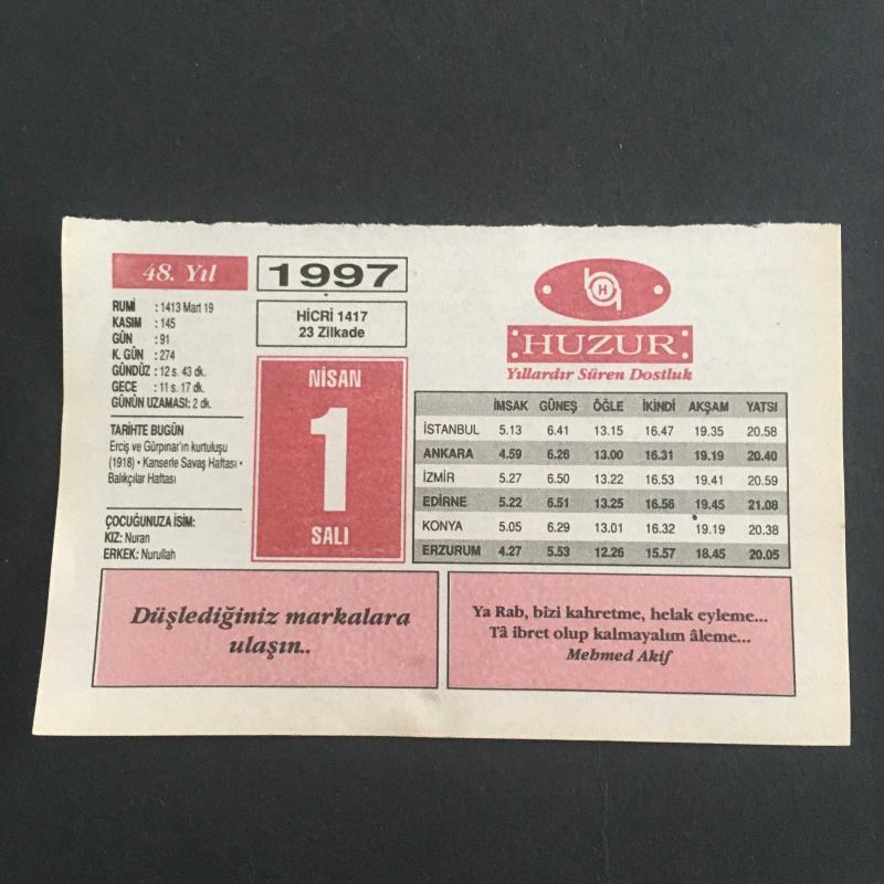 1 NİSAN 1997 -TAKVİM YAPRAĞI-DOĞUM GÜNÜ HEDİYESİ-HUZUR TAKVİMİ,ERCİŞ VE GÜRPINARIN KURTULUŞU,1918,KANSERLE SAVAŞ HAFTASI BALIKÇILAR HAFTASI,ÇOCUĞUNUZA İSİM,SÖZ DEĞİL FİİL,HİSARDAKİ LAFZ I MUHAMMED