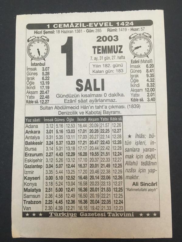 1 TEMMUZ 2003-TAKVİM YAPRAĞI-DOĞUM GÜNÜ HEDİYESİ-TÜRKİYE GAZETESİ TAKVİMİ,SULTAN ABDULMECİD İN TAHTA ÇIKMASI 1839 DENİZCİLİK VE KABOTAJ BAYRAMI,AKLIN DİNDEKİ YERİ