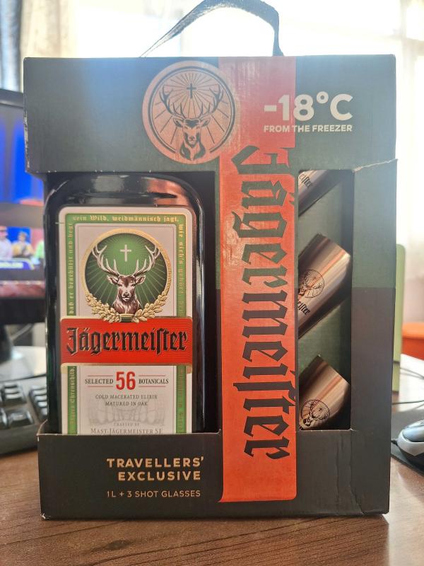 1 litre Jägermeister. 3 metal shot bardağı ve ayrıca 3 cam shot bardağı yine orjinal Jägermeister toplam 6 bardak