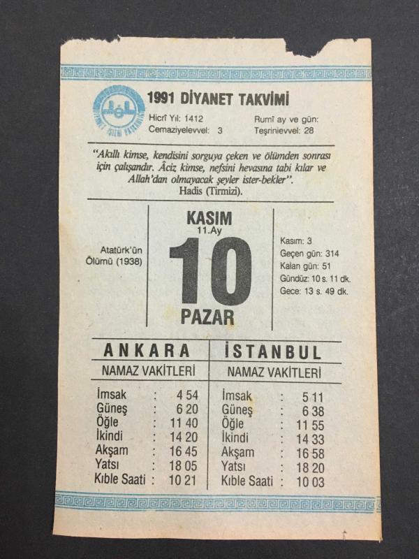 10 KASIM 1991 -TAKVİM YAPRAĞI-DOĞUM GÜNÜ HEDİYESİ-DİYANET TAKVİMİ,ATATÜRKÜN ÖLÜMÜ 1938,ATATÜRK Ü BUGÜN KAYBETTİK