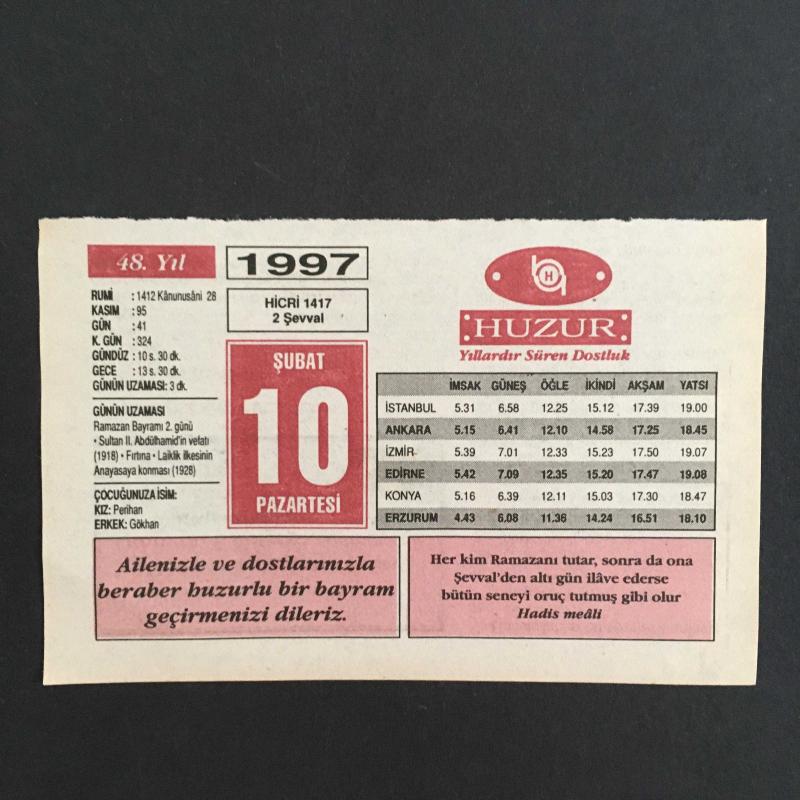 10 ŞUBAT 1997-TAKVİM YAPRAĞI-DOĞUM GÜNÜ HEDİYESİ-HUZUR TAKVİMİ,2.ABDULHAMİDİN VEFATI,1918,FIRTINA LAİKLİK İLKESİNİN ANAYASAYA KONMASI 1928,ÇOCUĞUNUZA İSİM,RAMAZAN BAYRAMI,