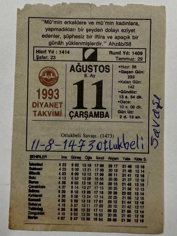 11 Ağustos 1993 orijinal İmam Hatip takvim yaprağı (Cin Ali kitabı hediyeli:)