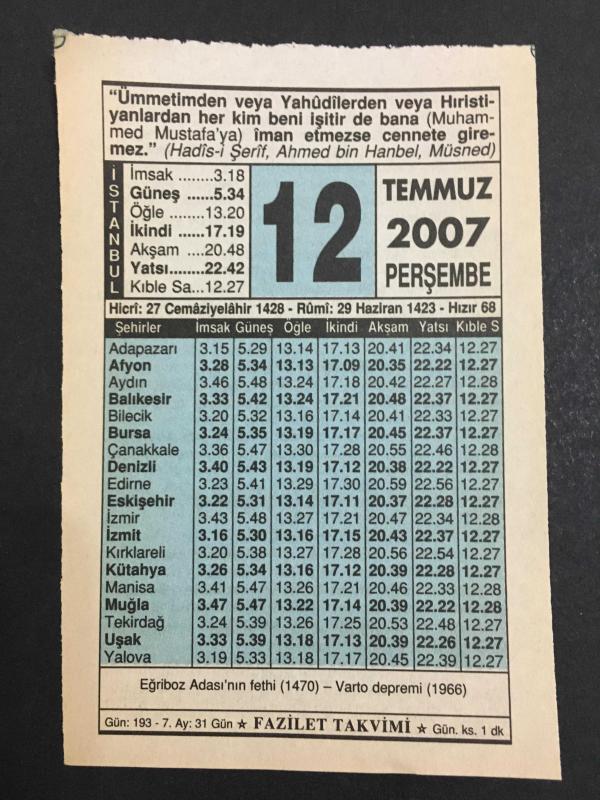 12 TEMMUZ 2007 -TAKVİM YAPRAĞI-DOĞUM GÜNÜ HEDİYESİ-FAZİLET TAKVİMİ,EĞRİBOZ ADASININ FETHİ 1470,VARTO DEPREMİ 1966,HERAKLİYUS UN RUMLARI İSLAMİYETE DAVET EDİŞİ
