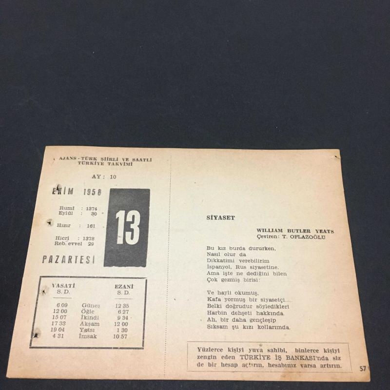 13 EKİM 1958 -TAKVİM YAPRAĞI-DOĞUM GÜNÜ HEDİYESİ-AJANS-TÜRK ŞİİRLİ VE SAATLİ TÜRKİYE TAKVİMİ,WILLIAM BUTLER YEATS,BJÖRNSTERNE BJÖRNSON,FAL,FIKRA,ANKARANIN HÜKÜMET MERKEZİ OLUŞU,1923,ANATOLE FRANCENİN ÖLÜMÜ 1924,GÜZEL SÖZ,YEMEK LİSTESİ