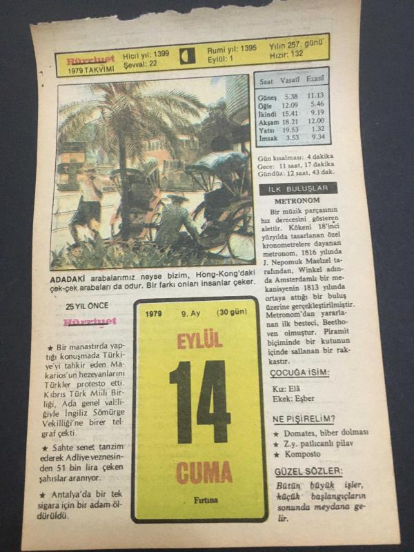 14 EYLÜL 1979-TAKVİM YAPRAĞI-DOĞUM GÜNÜ HEDİYESİ-HÜRRİYET TAKVİMİ,ÇOCUĞA İSİM,BİR YEMEK KUZU KAPAMA,MANYAS ,KARACABEY MUSTAFAKEMALPAŞA BERGAMA VE DİKİLİ NİN KURTULUŞLARI,HAVZA PANAYIRI,GEYVE PANAYIRI,CEMAL GÜRSELİN ÖLÜMÜ 1966
