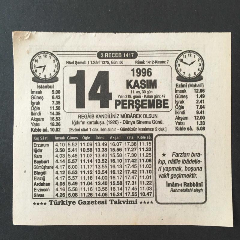 14 KASIM 1996 -TAKVİM YAPRAĞI-DOĞUM GÜNÜ HEDİYESİ-TÜRKİYE GAZETESİ TAKVİMİ,REGAİP KANDİLİ,IĞDIRIN KURTULUŞU,1920,DÜNYA SİNEMA GÜNÜ,