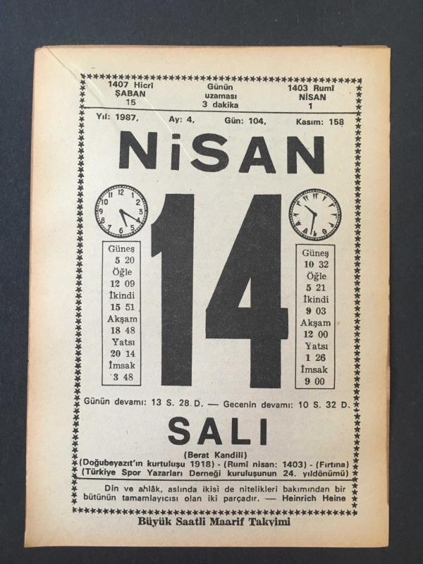 14 NİSAN 1987 -TAKVİM YAPRAĞI-DOĞUM GÜNÜ HEDİYESİ-BÜYÜK SAATLİ MAARİF TAKVİMİ,BERAT KANDİLİ,DOĞUBEYAZITIN KURTULUŞU 1918,TÜRKİYE SPOR YAZARLARI DERNEĞİ KURULUŞUNUN 24.YILDÖNÜMÜ,KANDEDİR,HACET YOK,VOLTAİRE DEN