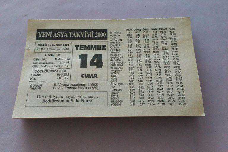 14 temmuz 2000 takvim yaprağı (yeni asya takvimi)