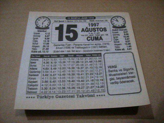 15 ağustos 1997 takvim yaprağı (türkiye gazetesi takvimi)