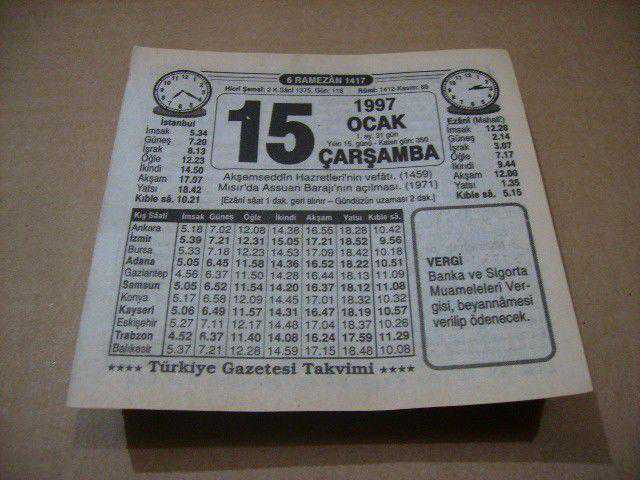 15 ocak 1997 takvim yaprağı (türkiye gazetesi takvimi)