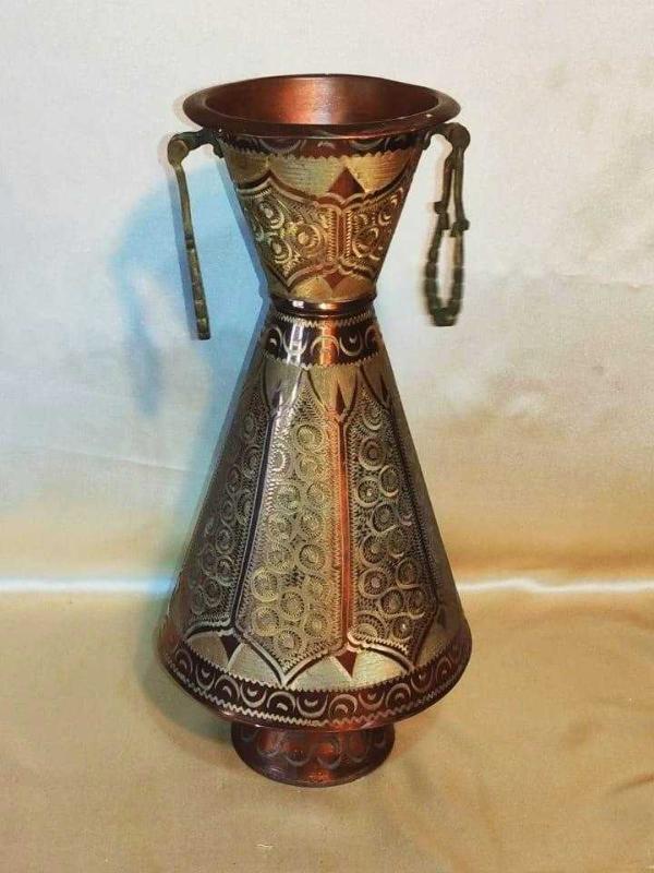 15308-Bakır üzeri el dövme işlemeli pirinç saplı vazo