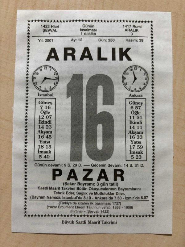 16 ARALIK 2001 - TAKVİM YAPRAĞI - DOĞUM GÜNÜ HEDİYESİ - BÜYÜK SAATLİ MAARİF TAKVİMİ - TURAN KALAYCIOĞLU - ŞEKER BAYRAMI KUTLU OLSUN - NACİ KASIM - TÜRKİYE'DE İLK KİTAP BASILDI - MUSUL IRAK'A VERİLDİ - MİZAH YAZARI ÖĞRETMEN ERCÜMENT EKREM TALU VEFAT ETTİ