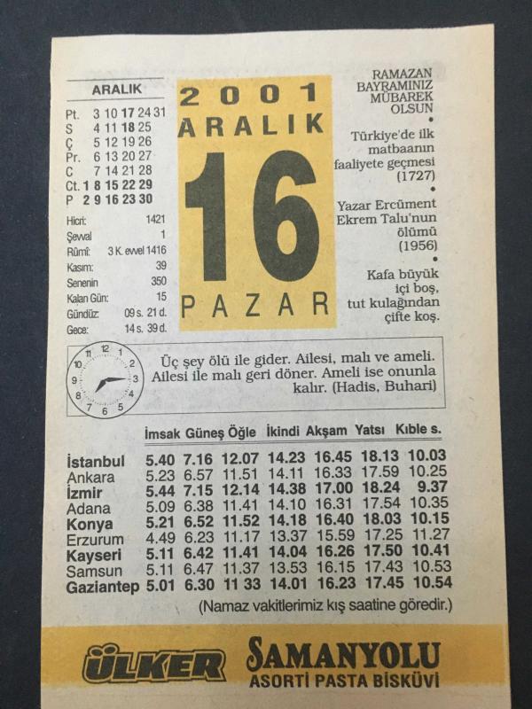 16 ARALIK 2001-TAKVİM YAPRAĞI-DOĞUM GÜNÜ HEDİYESİ-ÜLKER TAKVİMİ,TÜRKİYEDE İLK MATBANIN FALİYETE GEÇMESİ 1727,YAZAR ERCÜMENT EKREM TALUNUN ÖLÜMÜ 1956,SADAKAI FITR
