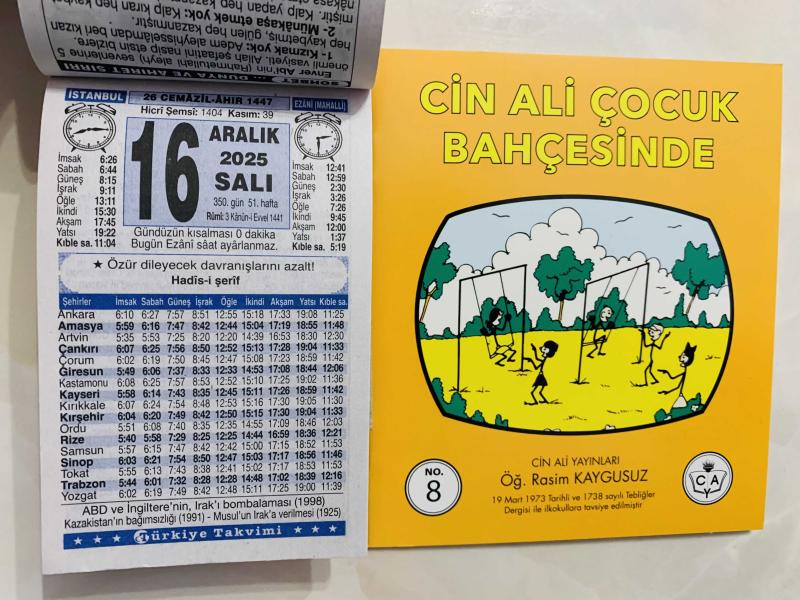 16 Aralık 2025 hediyelik orijinal Türkiye takvim yaprağı (Cin Ali kitabı hediyeli:)