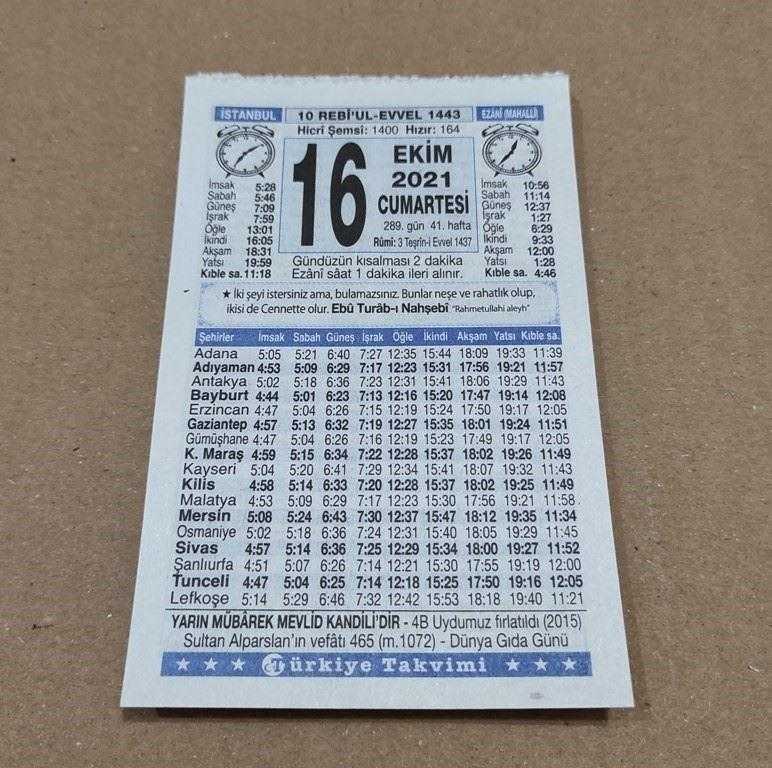 16 ekim 2021 takvim yaprağı (türkiye takvimi)