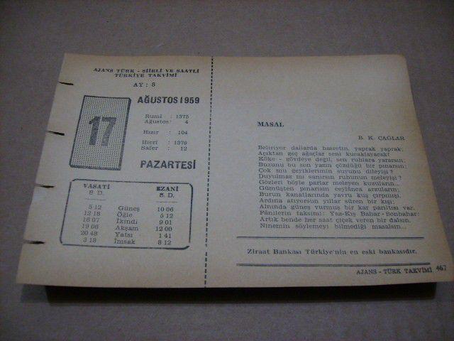 17 ağustos 1959 takvim yaprağı (ajans türk şiirli ve saatli türkiye takvimi)