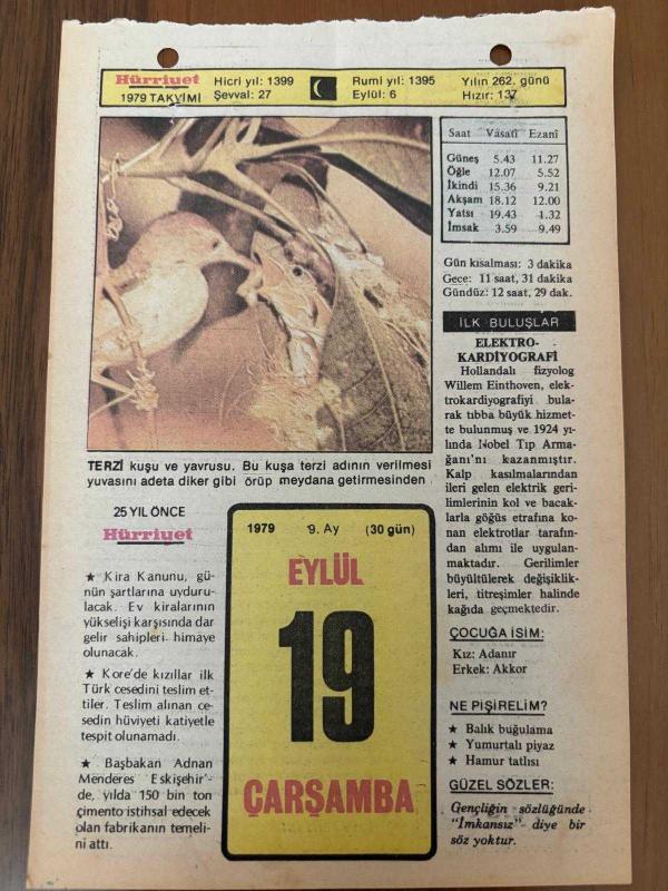19 EYLÜL 1979 - TAKVİM YAPRAĞI - DOĞUM GÜNÜ HEDİYESİ - HÜRRİYET TAKVİMİ - PİS BİR İŞ ROMANI - Şampiyon alet Cahit Önel'in ölümü (1970) - Konya Şeker Fabrikası'nın açılış (1954) - Yavuz Sultan Selim'in Diyarbakır'ı fethi (1515)