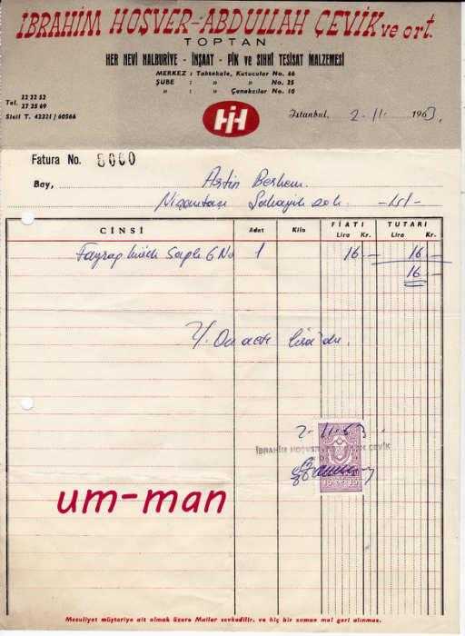 1963 İBRAHİM HOŞVER-ABDULLAH ÇEVİK FATURASI