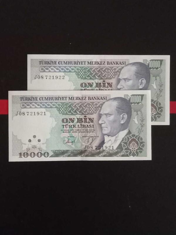 2 Adet Sıralı Takipli 7. Emisyon 10.000 Türk Lirası Eski Koleksiyon Kağıt Para. T.C Banknotlar. Cumhuriyet Dönemi.