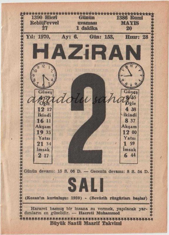 2 Haziran 1970 / Büyük Saatli Maarif Takvimi