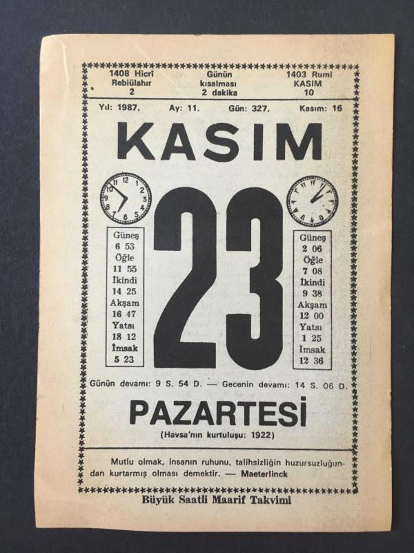 23 KASIM 1987 -TAKVİM YAPRAĞI-DOĞUM GÜNÜ HEDİYESİ-BÜYÜK SAATLİ MAARİF TAKVİMİ,HAVSANIN KURTULUŞU 1922,FEDAKAR ANA,OLALIM,EVLİLİKTE SAADET