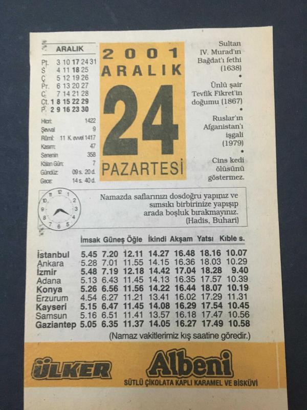 24 ARALIK 2001-TAKVİM YAPRAĞI-DOĞUM GÜNÜ HEDİYESİ-ÜLKER TAKVİMİ,4.MURATIN BAĞDATI FETHİ 1638,TEVFİK FİKRETİN DOĞUMU 1867,RUSLARIN AFGANİSTANI İŞGALİ 1979,BAĞDATIN FETHİ