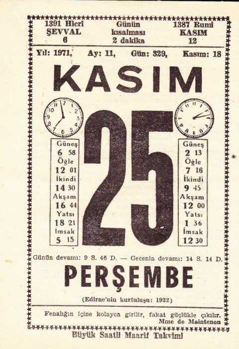 25 KASIM 1971 SAATLİ MAARİF TAKVİMİ YAPRAĞI