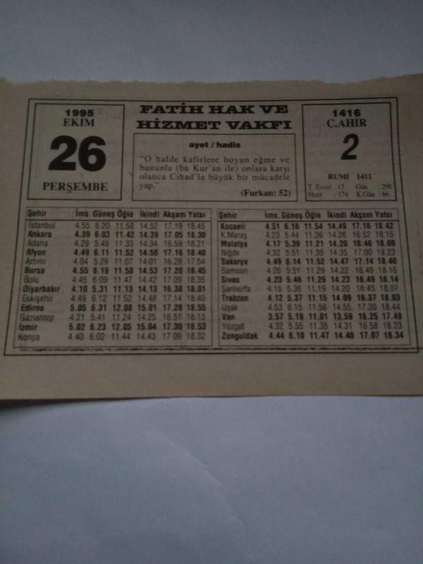 29 Ekim 1995-Orijinal Takvim Yaprağı-Doğum Günü-Söz,Nişan,Nikâh,Düğün ve Önemli Günler Hediyesi-Fatih Hak ve Hizmet Vakfı-Ayet/Hadis(Müslim,Selâm:125)-Dönme!-Erzurumlu Emrah-Vazife Şuuru